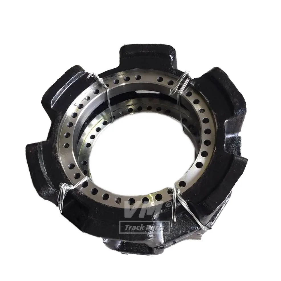 A sprocket (also known as a drive sprocket or final drive sprocket) is the large, toothed wheel located at the rear of each track frame. It is the powered wheel that delivers engine power to the track, propelling the machine.